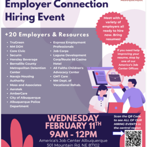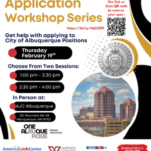 Get in-person support with applying to City of Albuquerque positions by joining us on February 19th, for the City of Albuquerque Application Workshop Series!Scan the QR code to reserve your spot and choose from one of two available sessions. If you would like assistance updating your resume with one of our career consultants, or if […]