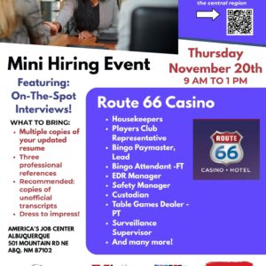 Join us on November 20, 2025, for a Mini Hiring Event featuring multiple positions available with Route 66 Casino! Bring copies of your resume and unofficial transcripts. If you would like assistance updating your resume with one of our career consultants, or if you wish to research new career options and employers, visit us at […]