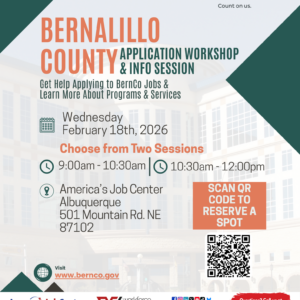 Join us for the Bernalillo County Application Workshop & Info Session on Wednesday, February 18th, 2026! Get direct help with your Bernalillo County job applications and explore the various programs and services they offer. Scan the QR code on the flyer to reserve your spot for one of the two available sessions. If you would […]