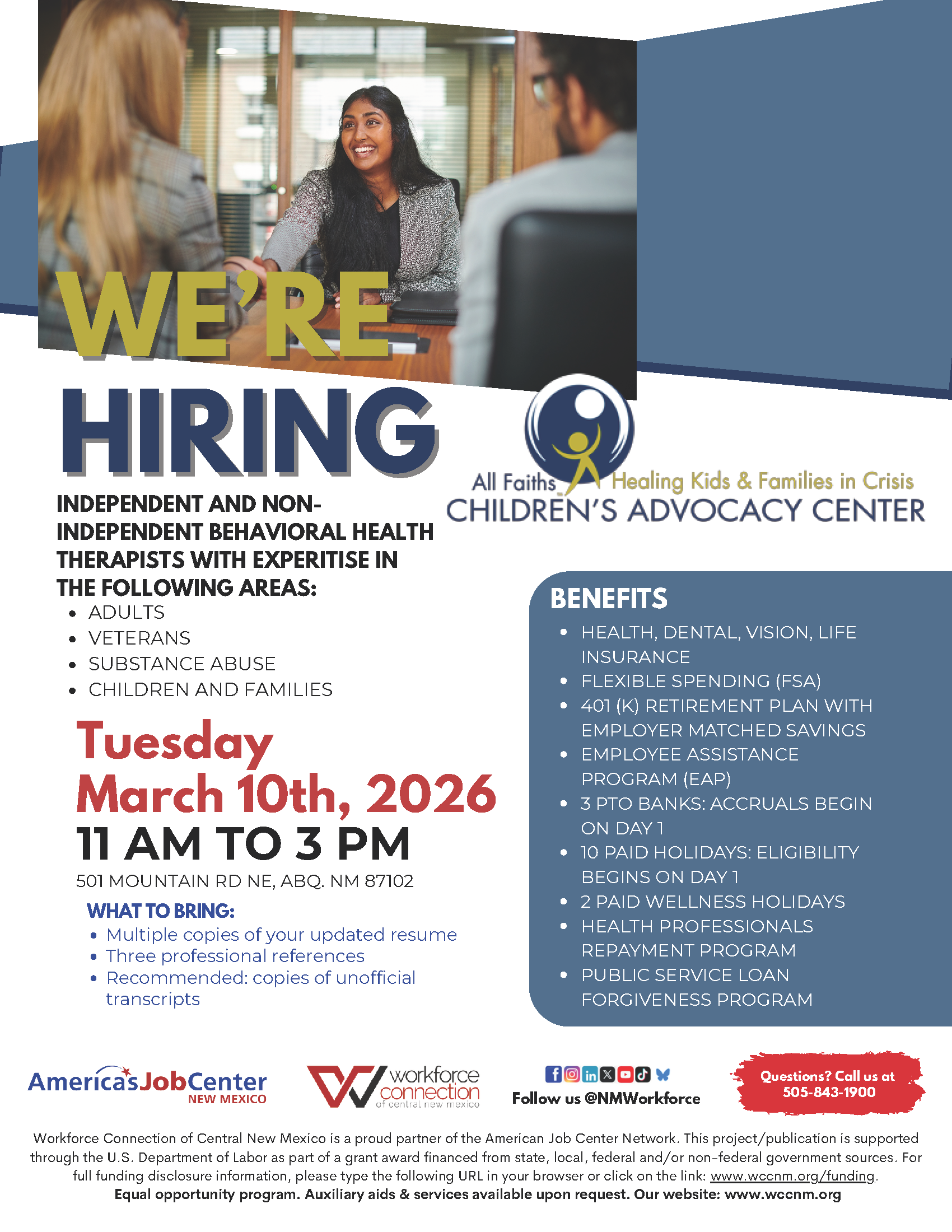 Join us on March 10th, 2026, for a Mini Hiring Event featuring multiple positions available with All Faiths Children’s Advocacy Center! Bring copies of your resume and unofficial transcripts.