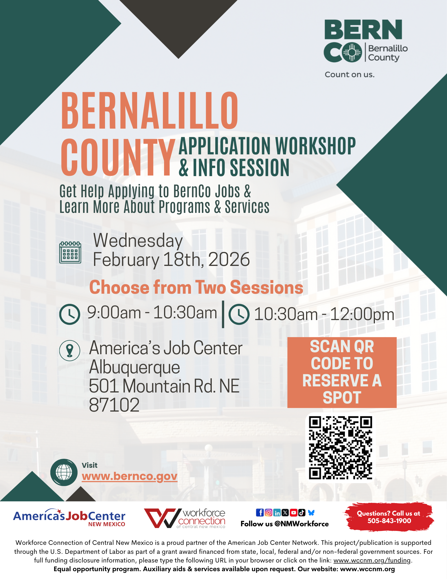 Join us for the Bernalillo County Application Workshop & Info Session on Wednesday, February 18th, 2026! Get direct help with your Bernalillo County job applications and explore the various programs and services they offer. Scan the QR code on the flyer to reserve your spot for one of the two available sessions.
