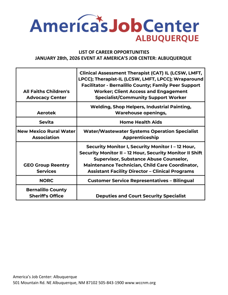 For more information, call our Welcome Desk at 505-843-1900, or explore our many career resources for job seekers here: https://www.wccnm.org/individuals/i-need-education-and-training/