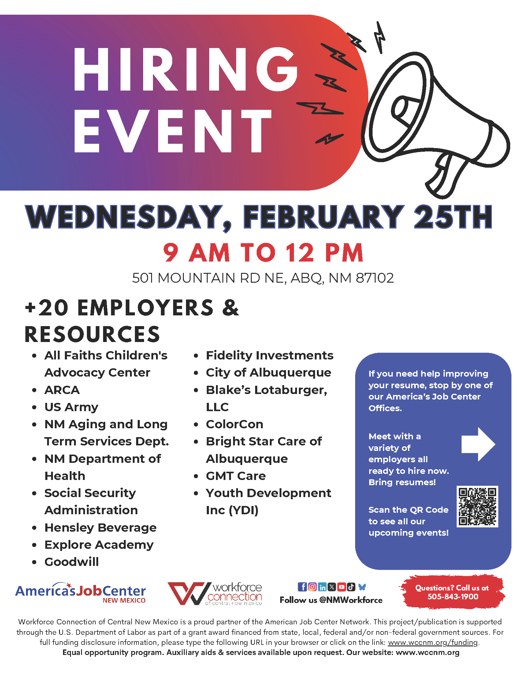 Join us on February 25th, from 9 AM to 12 PM, for the America’s Job Center Hiring Event. Explore new career opportunities with multiple employers across a variety of fields. Be sure to bring an updated resume!
