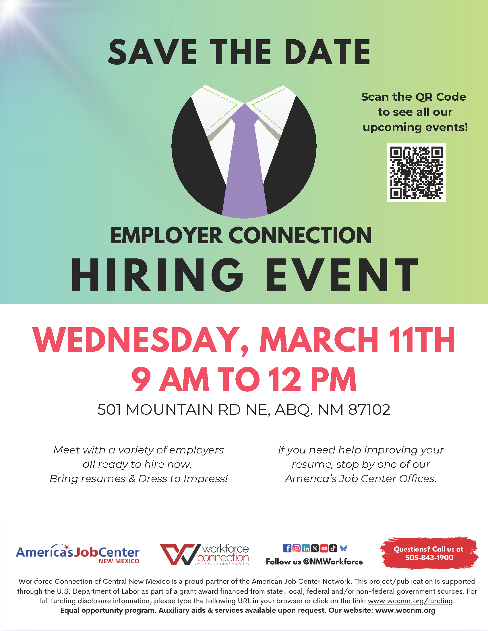 For more information, call our Welcome Desk at 505-843-1900, or explore our many career resources for job seekers here: https://www.wccnm.org/individuals/i-need-education-and-training/