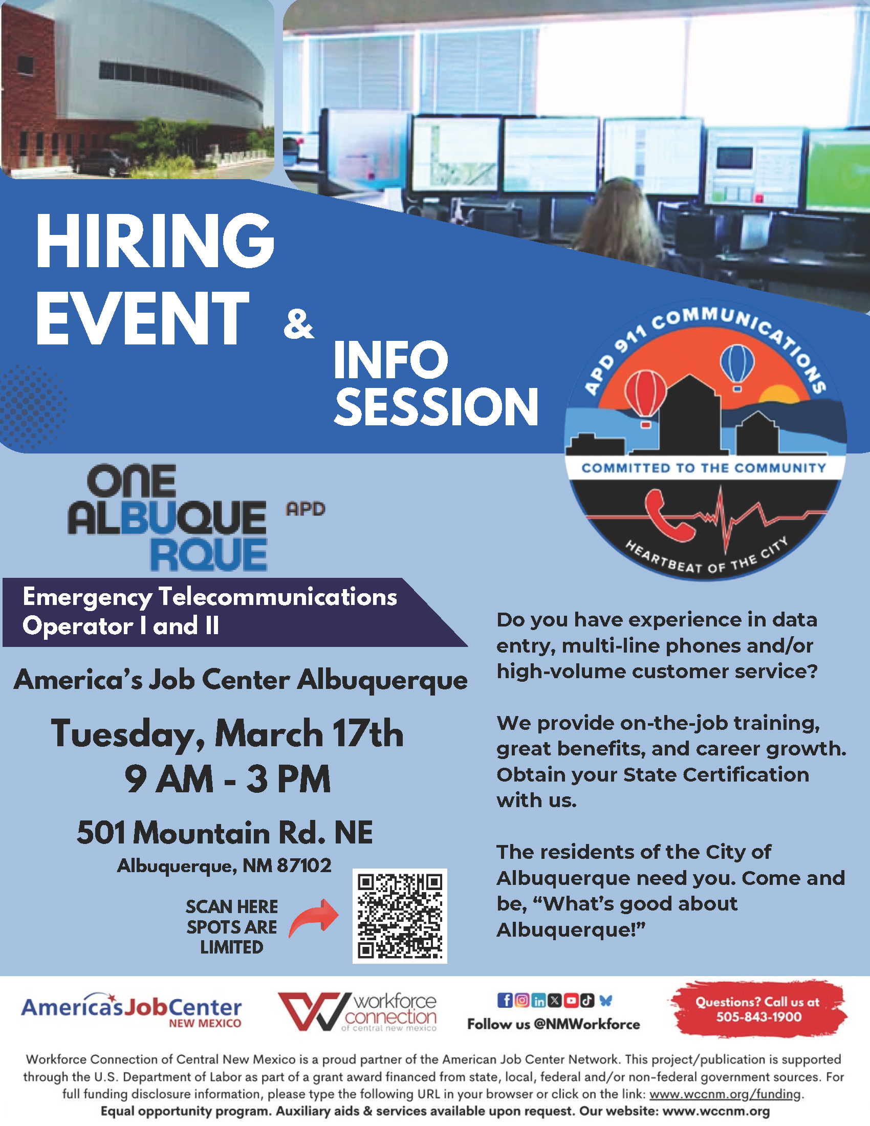 Join us on March 17th, 2026, for a Mini Hiring Event featuring multiple positions available with One Albuquerque APD 911 Communications! Bring copies of your resume and unofficial transcripts.