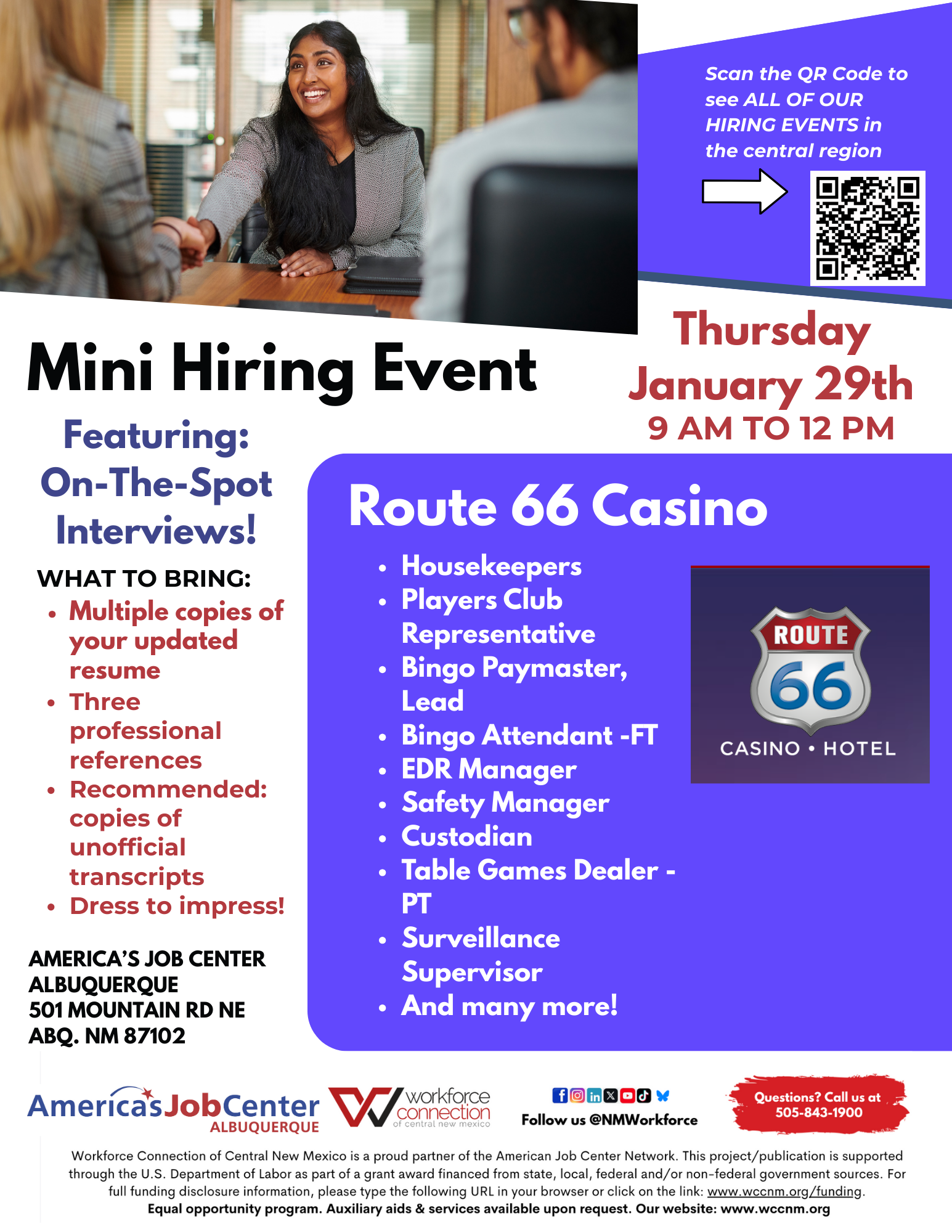 Join us on January 29th, 2026, for a Mini Hiring Event featuring multiple positions available with Route 66 Casino! Bring copies of your resume and unofficial transcripts.