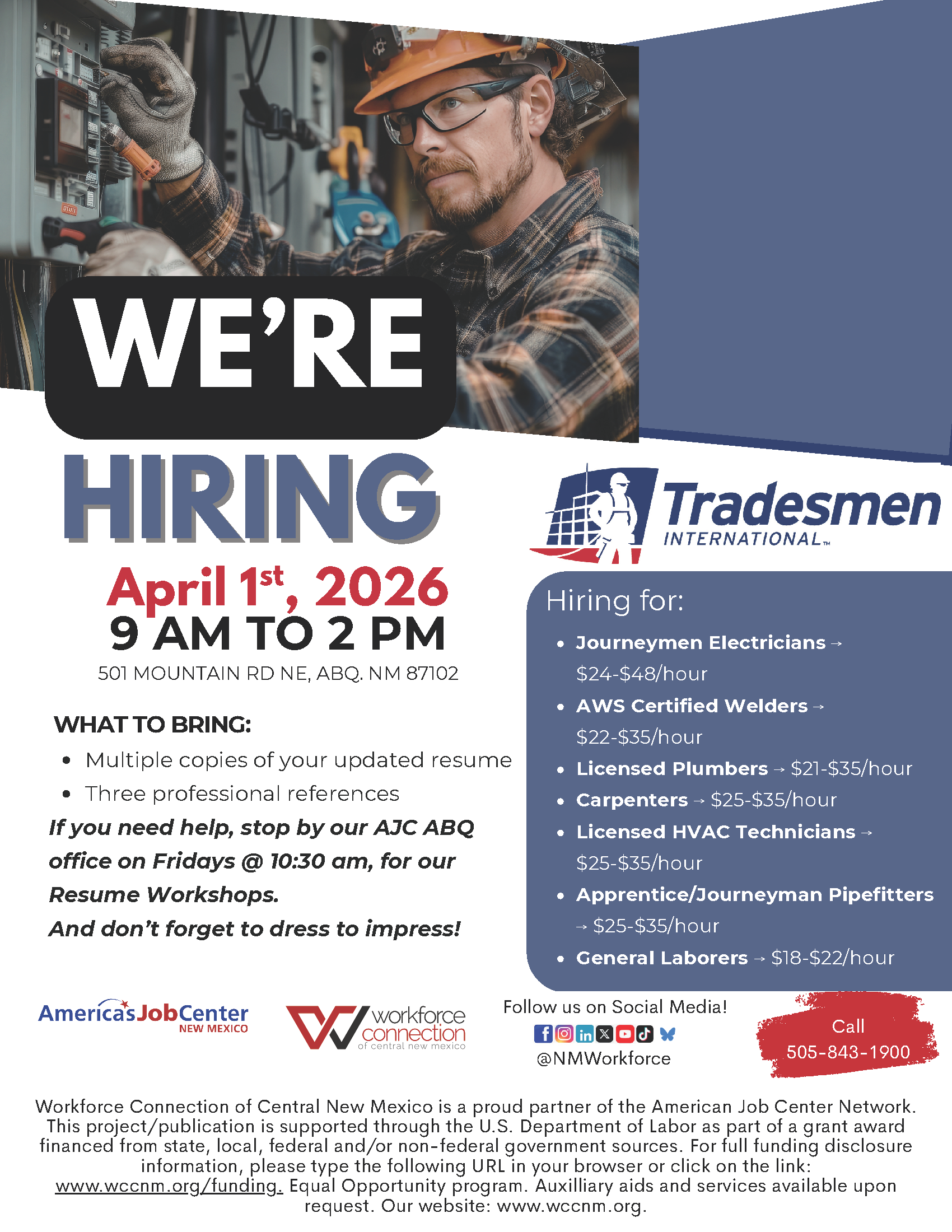 Join us on April 1st, 2026, for a Mini Hiring Event featuring multiple positions available with Tradesmen International! Bring copies of your resume and unofficial transcripts.
