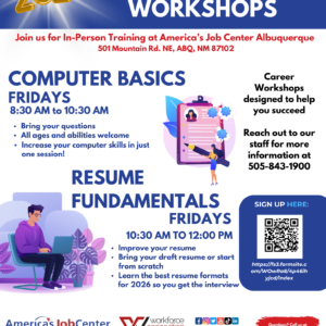 Are you interested in getting trained for a new career or want better pay? We invite you to attend one of our free career workshops each Monday at 9 AM and 3 PM at our Albuquerque Workforce Connection Office. Each Career Workshop is approximately one hour long. Walk-ins are welcome! You can learn about the […]